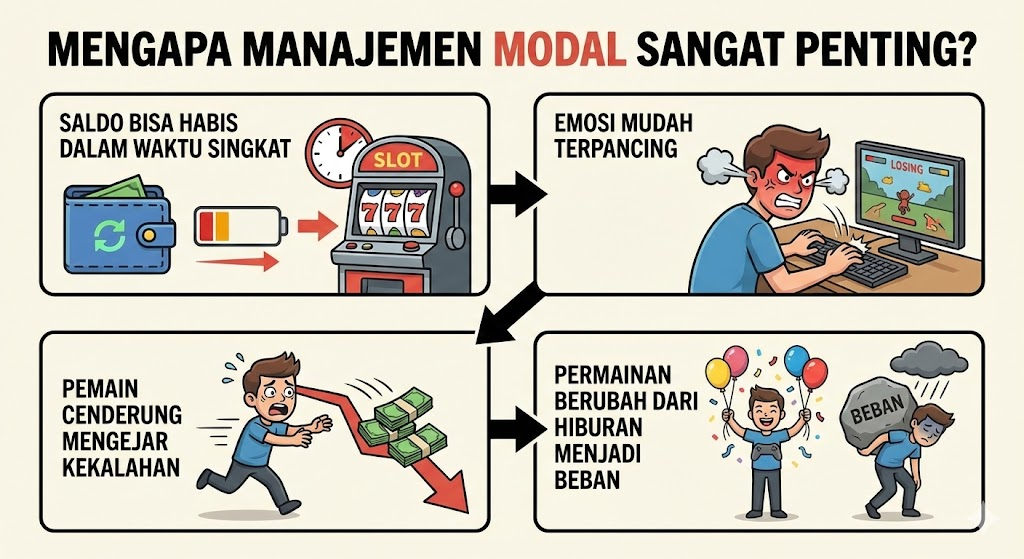 Salah satu penyebab utama pemain slot online mengalami kerugian besar bukan karena permainan itu sendiri, melainkan karena manajemen modal yang buruk. Banyak pemain langsung fokus pada kemenangan, namun lupa bahwa pengelolaan saldo adalah fondasi utama agar permainan bisa berlangsung lebih lama dan tetap terkendali.